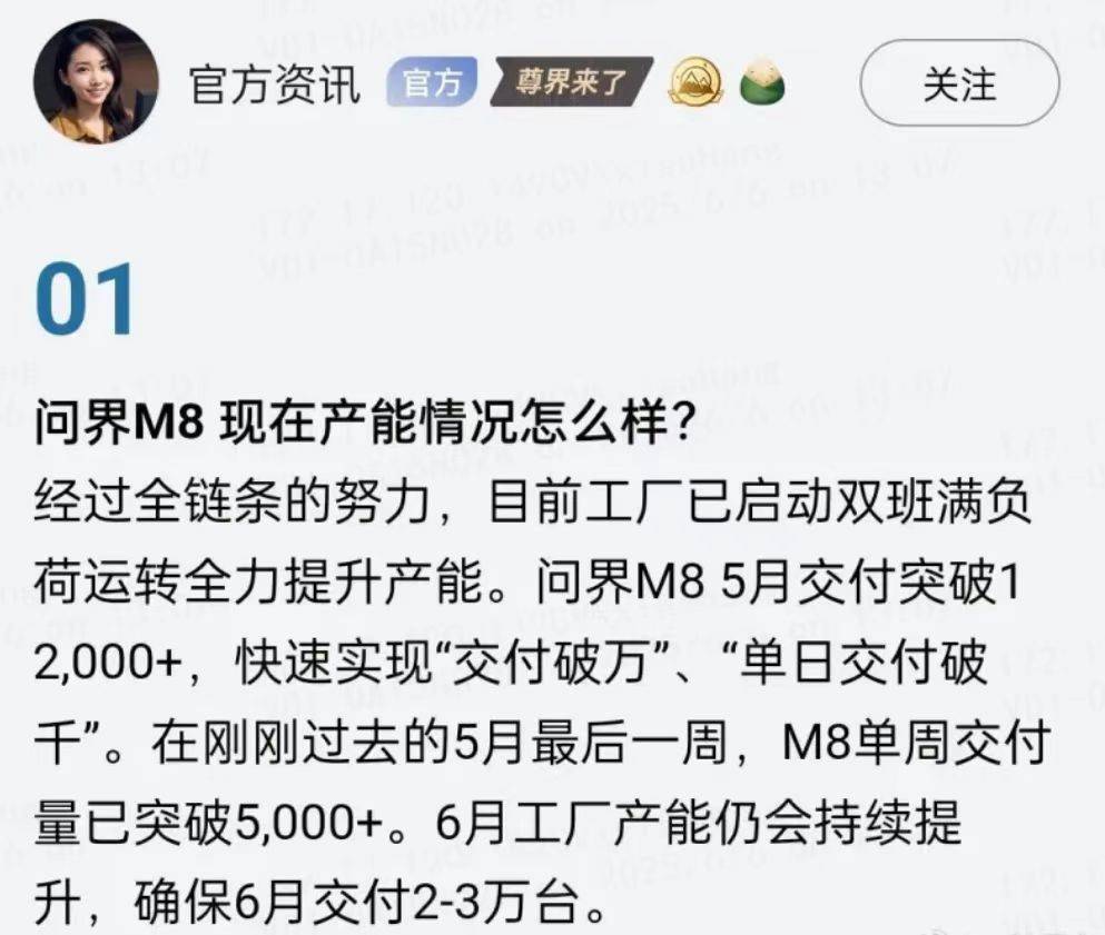面对消费者的热切期待,问界官方迅速响应,明确表态六月内M8车型将至少交付2至3万辆。这一数据若非亲眼所见,恐怕难以令人信服。毕竟,在40万级别的豪华车市场中,单月销量突破两三万辆,无疑是一项前所未有的壮举。
