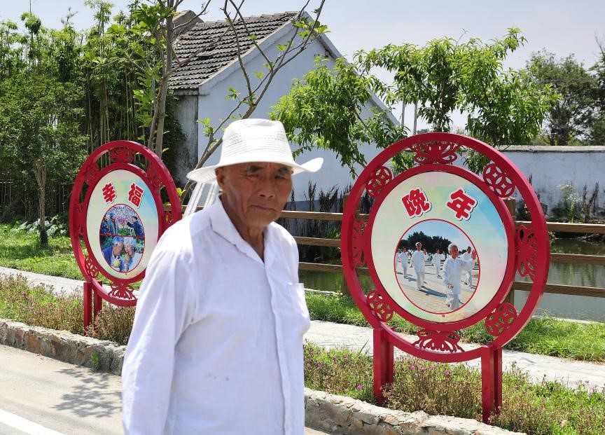 2018年6月12日,南京郊区农村街道上一位老人从“幸福晚年”的公益宣传牌前走过。视觉中国