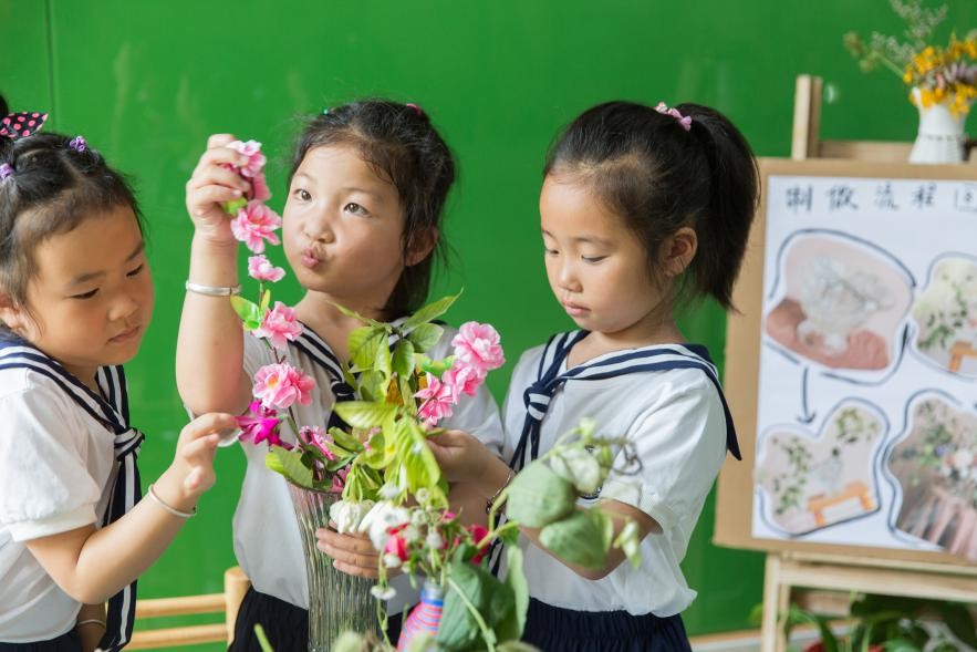 2018年6月26日,江苏南通如皋市经济开发区第二实验幼儿园的孩子们在校自然花艺坊学插花。视觉中国