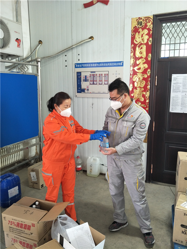 “要落实一盘棋思想,公司罗中区域的承包商也要执行公司疫情防控要求”,她对罗中区域17家承包商逐一排查,细节之处盯得更紧,看到承包商餐厅容易交叉感染,她提醒严禁进入后堂打餐,在入口处要对垫脚垫消毒,对生活垃圾处理更是亲自监督,全程做好消毒处理。