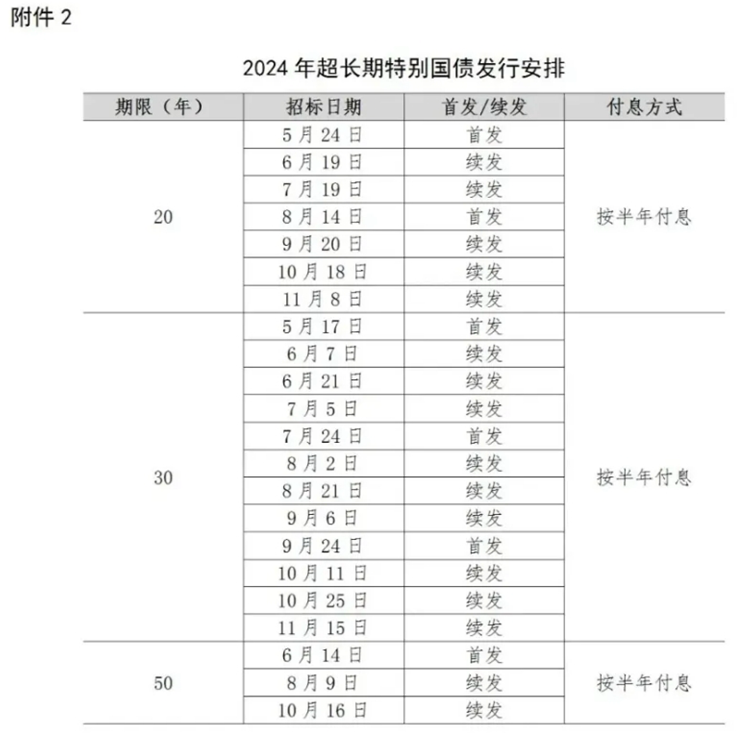 發行安排已公佈:今年先發行1萬億元,期限分別為20年、30年、50年。30年期超長期特別國債已于5月17日首發,6月7日續發;20年期超長期特別國債已于5月24日首發;50年期超長期特別國債將於6月14日首發。