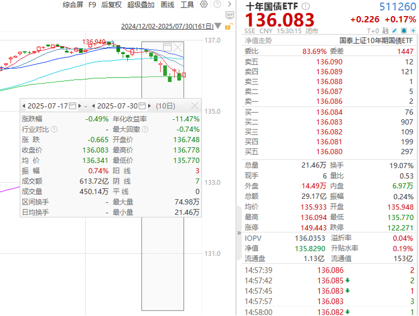 ETF(511260)、国债ETF(511010)7月30日均有一定程度的上涨,持续数日的下跌态势趋缓。
