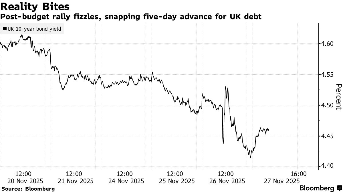 尽管面临诸多状况,英国国债与英镑两大市场本周依旧实现累计上涨。当下,交易员们的目光已聚焦于英国央行下个月降息的可能性。货币市场几乎已充分定价,认为英国央行12月降息25个基点的概率接近90%,并且预计到2026年至少还会再降息一次,原因是财政大臣所推出的措施被预测将会对经济增长形成拖累。